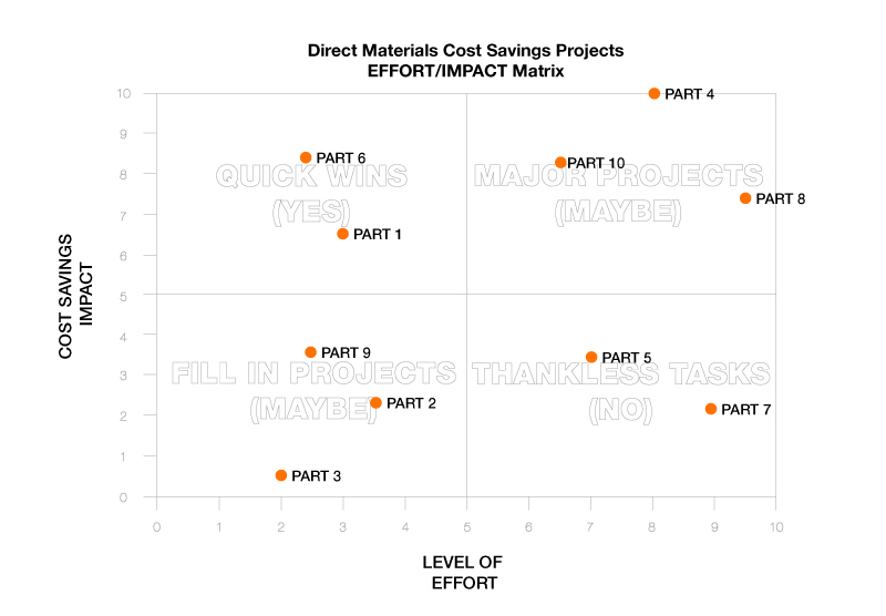 Next, you’ve plotted each project (each part #) on a graph with the EFFORT score on one axis and the IMPACT score on another axis.